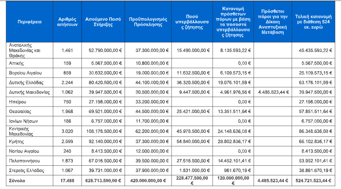 Επίσης, επιπλέον των ανωτέρω ποσών διατίθενται 4,5 εκατ. ευρώ για την ικανοποίηση της δέσμευσης για πλήρη ένταξη των υποψηφίων της Περιφέρειας Δυτικής Μακεδονίας στο πλαίσιο της Δίκαιης Αναπτυξιακής Μετάβασης, σύμφωνα με τον πίνακα που ακολουθεί.