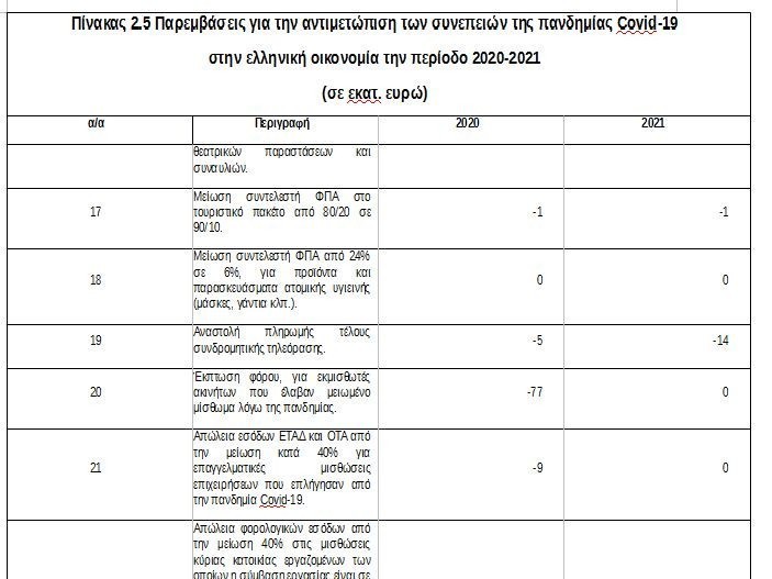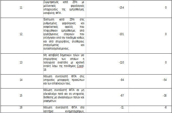 επέκταση της μείωσης του ΦΠΑ σε διάφορες κατηγορίες αγαθών και υπηρεσιών κλάδων που πλήττονται από την πανδημία έως τον Απρίλιο του 2021 και την αναστολή πληρωμής του τέλους συνδρομητικής τηλεόρασης, με συνολικό κόστος 113 εκατ. ευρώ για το 2021.
