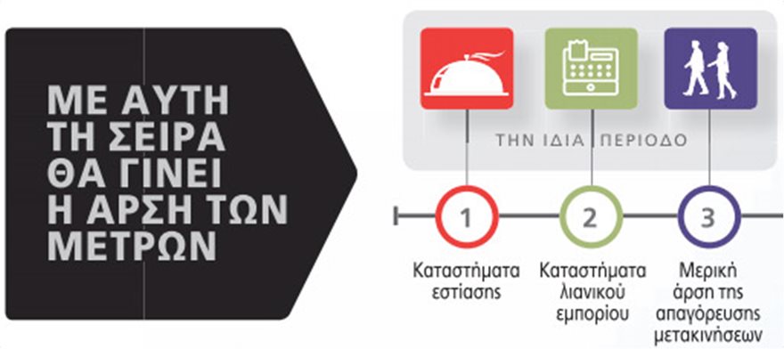 Ασφαλείς πληροφορίες αναφέρουν ότι η αρχή θα γίνει από την εστίαση και σε δεύτερη φάση θα ακολουθήσουν τα εμπορικά καταστήματα. Η συγκεκριμένη προτεραιότητα, σύμφωνα με τις ίδιες πηγές, στηρίζεται σε δύο άξονες: αφενός να ξεκινήσει και πάλι η δραστηριότητα τμημάτων της αγοράς που θα ενισχύσουν την οικονομία αλλά και τα δημόσια οικονομικά, αφετέρου να μπορούν να τηρηθούν περιοριστικοί κανόνες στο κομμάτι της ασφάλειας υγείας.