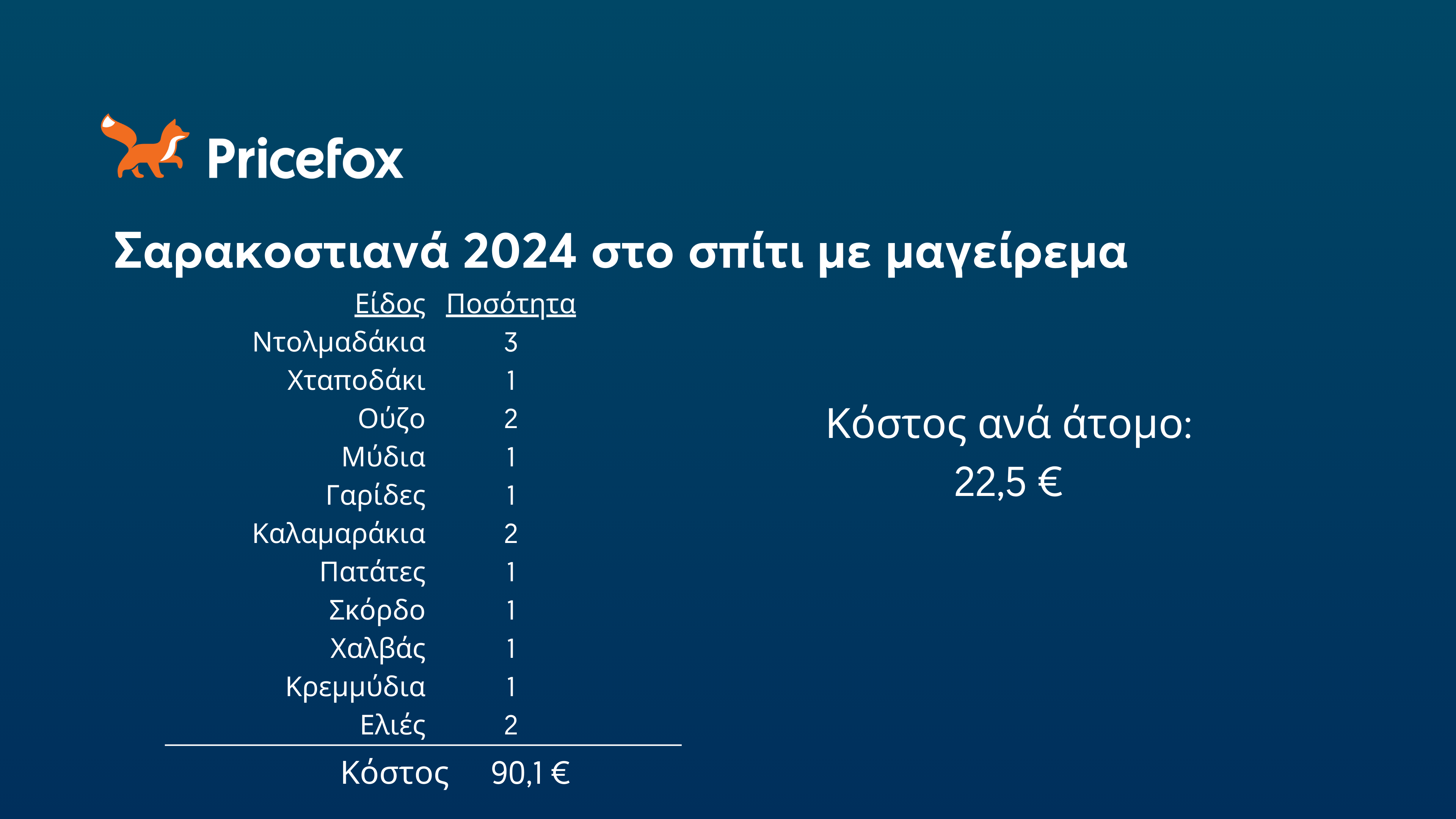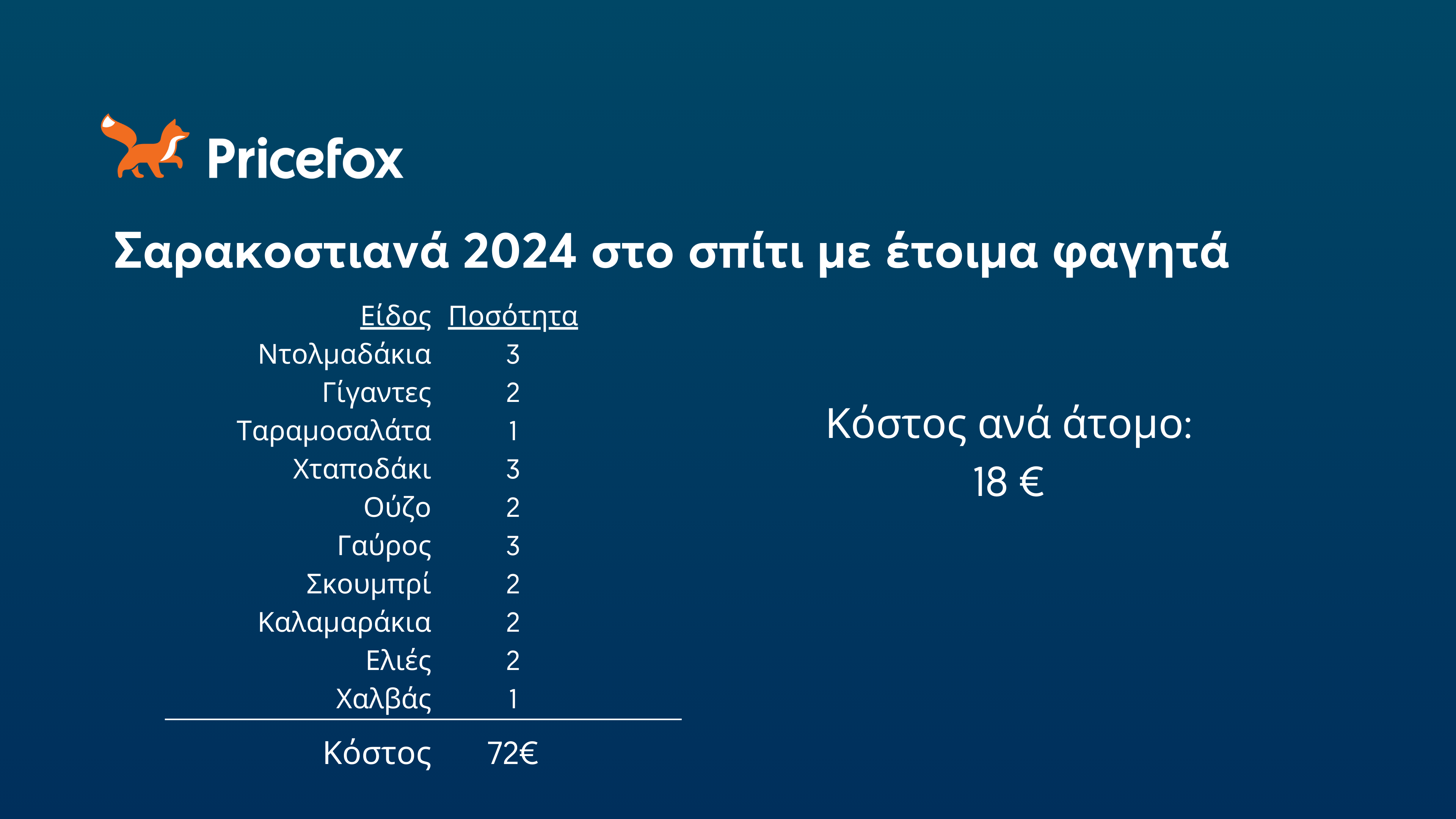 Συγκρίνοντας τις τιμές από δύο μεγάλες αλυσίδες σούπερ μάρκετ, το κόστος των έτοιμων Σαρακοστιανών για ένα τραπέζι με φίλους (4 ατόμων) ανέρχεται περίπου στα 70- 74 ευρώ, το άτομο δηλαδή από 17 έως 18 ευρώ.