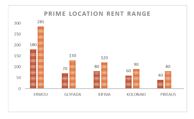 Ως προς τις τιμές των ενοικίων, οι υψηλότερες τιμές, όπως είναι εύλογο παρατηρούνται στην Ερμού και κυμαίνονται από τα 180 ευρώ έως τα 285 ευρώ ανά τ.μ. κατ’ ανώτατο όριο. Ακολουθεί η Γλυφάδα με τις ανώτατες τιμές των ενοικίων να αγγίζουν τα 130 ευρώ ανά τ.μ., ξεκινώντας από τα 80 ευρώ, ενώ στην περίπτωση της Κηφισιάς η διακύμανση είναι από τα 80 έως τα 120 ευρώ ανά τ.μ.. Χαμηλότερα έχει πέσει το Κολωνάκι με τα μισθώματα να διαμορφώνονται μεταξύ 60 και 90 ευρώ ανά τ.μ..