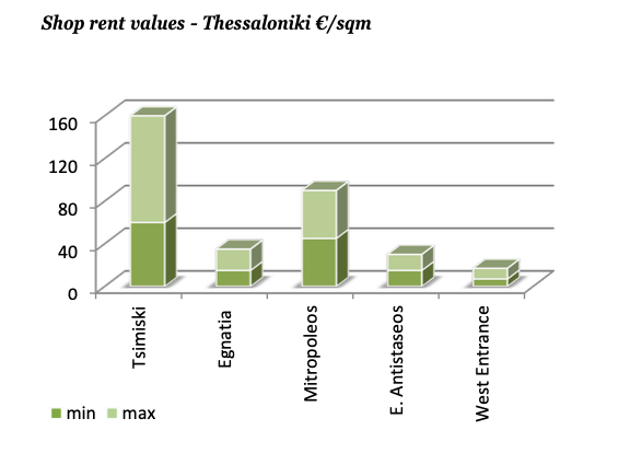 Στην περίπτωση της Θεσσαλονίκης, το ανώτατο ενοίκιο στην οδό Τσιμισκή, που είναι και η πρώτη αγορά για τη συμπρωτεύουσα κυμαίνεται λίγο κάτω από τα 160 ευρώ ανά τ.μ., ενώ στην ίδια οδό το κατώτατο όριο εντοπίζεται στα πέριξ των 40 ευρώ ανά τμ.. Στην οδό Μητροπόλεως το ανώτατο όριο φθάνει τα 80 ευρώ ανά τ.μ., και το κατώτατο τα 40 ευρώ, ενώ κατά πολύ χαμηλότερα είναι τα ενοίκια σε σημεία όπως η Εγνατία, η Εθνικής Αντιστάσεων και η Δυτική Είσοδος της πόλης.