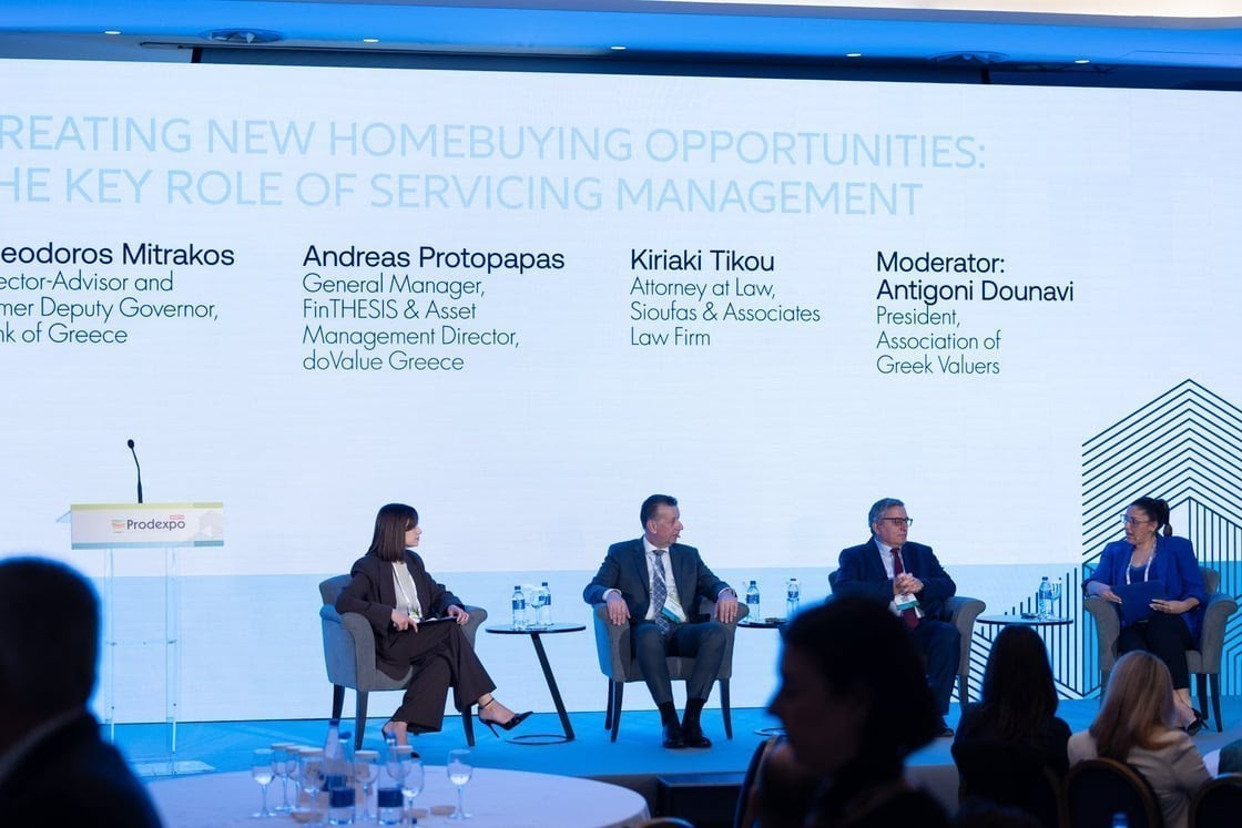 Λεζάντα κεντρικής φώτο: Από αριστερά: Κυριακή Τίκου, Δικηγόρος, Δικηγορική Εταιρεία Sioufas & Associates, Ανδρέας Πρωτόπαπας, Γενικός Διευθυντής, FinTHESIS & Asset Management Director, doValue Greece, Θεόδωρος Μητράκος, Διευθυντής-Σύμβουλος και πρώην Υποδιοικητής, Τράπεζα της Ελλάδος, Αντιγόνη Δούναβη, Πρόεδρος Συλλόγου Εκτιμητών Ελλάδος
