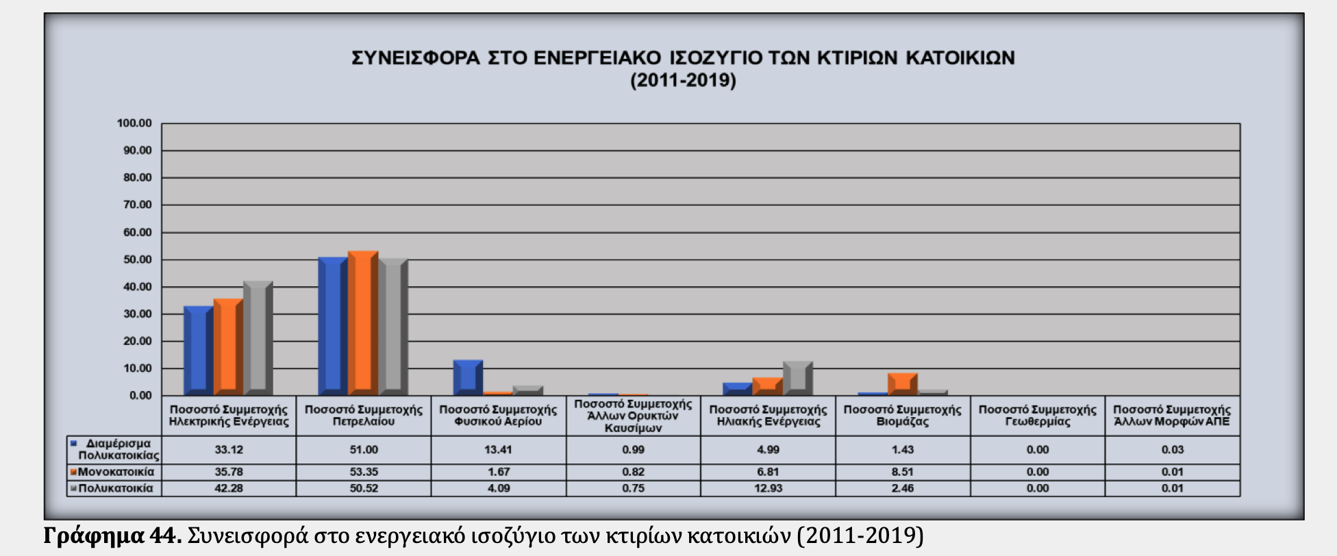 Το μέσο διαμέρισμα πολυκατοικίας καταναλώνει ετησίως 174,44 κιλοβατώρες ανά τετραγωνικό για θέρμανση, 32,34 kwh/τ.μ. για ψύξη και 55,49 kwh/τ.μ. για παραγωγή ζεστού νερού χρήσης. Σύμφωνα με την ανάλυση των στοιχείων από τις ενεργειακές επιθεωρήσεις της περιόδου 2011 – 2019, το πετρέλαιο συμμετέχει κατά μέσο όρο σε ποσοστό 51.38% στο ενεργειακό ισοζύγιο των κτιρίων κατοικίας, ενώ η ηλεκτρική ενέργεια κατά 33.70%.