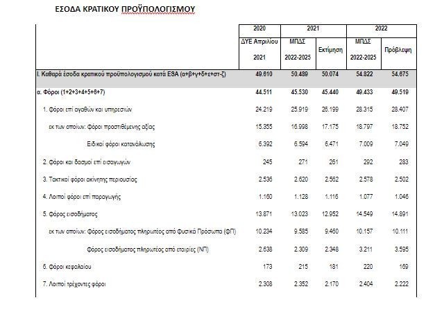 Την ίδια χρονιά όμως, το υπουργείο Οικονομικών προβλέπει ότι θα αυξηθούν κατά 4,1 δισ. ευρώ τα κρατικά έσοδα από φόρους: τα μισά εξ αυτών (1,9 δισ. ευρώ) από αύξηση των άμεσων φόρων εισοδήματος –λόγω επαναφοράς των φορολογητέων εισοδημάτων στα προ αποζημιώσεων COVID επίπεδα- και τα επιπλέον 2,1 δισ. ευρώ από έμμεσους φόρους λόγω ανάπτυξης και αύξησης της κατανάλωσης. Συγκεκριμένα, έναντι της εκτίμησης για το πώς κλείνει εφέτος η χρονιάς, οι φόροι εισοδήματος το 2022 θα αυξηθούν κατά 1,9 δισ. ευρώ (εκ των οποίων 650 εκατ. στα νοικοκυριά), οι έμμεσοι φόροι 2,2 δισ. (από 26,2 σε 28,4 δισ. ευρώ) και όλοι μαζί συνολικά κατά 4 δισ. (από 45,440 σε 49,519 δισ. ευρώ). Την αύξηση των εισπράξεων θα ευνοήσουν και τα νέα τεχνολογικά εργαλεία κατά της φοροδοαφυγή (MyDATΑ κλπ).