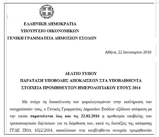 Τον Ιανουάριο του 2016 η Γενική Γραμματεία Δημοσίων Εσόδων (νυν Ανεξάρτητη Αρχή Δημοσίων Εσόδων) ανακοίνωνε ότι «εξέδωσε απόφαση με την οποία παρατείνεται έως 22.02.2016» η προθεσμία υποβολής διορθωτικών δηλώσεων. Η διορία θα έληγε Παρασκευή αλλά η τότε πολιτική ηγεσία του υπουργείου Οικονομικών φέρεται να διέρρεε σε επαγγελματικούς φορείς και φιλικά μέσα ενημέρωσης πως προτίθεται να δώσει σιωπηρή παράταση μέχρι την Δευτέρα 25 Ιανουαρίου για όλες τις δηλώσεις, αρχικές και τροποποιητικές.