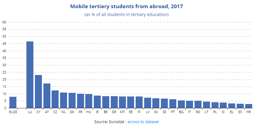 Οι ξένοι φοιτητές αντιπροσώπευαν ποσοστό 8,1%του συνολικού αριθμού φοιτητών στην ΕΕ. Τα μεγαλύτερα ποσοστά ξένων φοιτητών εμφανίζονταν στο Λουξεμβούργο (47%), την Κύπρο (23%) και την Αυστρία (17%), ενώ τα χαμηλότερα καταγράφηκαν σε Κροατία, Ισπανία και Ελλάδα με ποσοστό 3%.