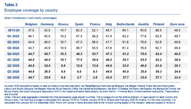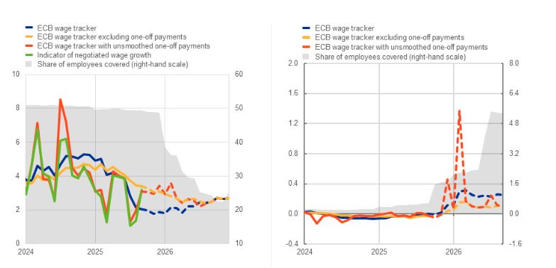 Ο δείκτης μισθών της ΕΚΤ, που δημοσιεύθηκε σήμερα Παρασκευή, προβλέπει ότι οι μισθοί θα αυξηθούν κατά 2,7% ετησίως το τέταρτο τρίμηνο του 2026, μετά από αύξηση 2,5% το τρίτο τρίμηνο. Αν και αυτό είναι πολύ κάτω από το υψηλό επίπεδο άνω του 5% το 2024, είναι ταχύτερο από την πρόβλεψη για το πρώτο εξάμηνο του επόμενου έτους.