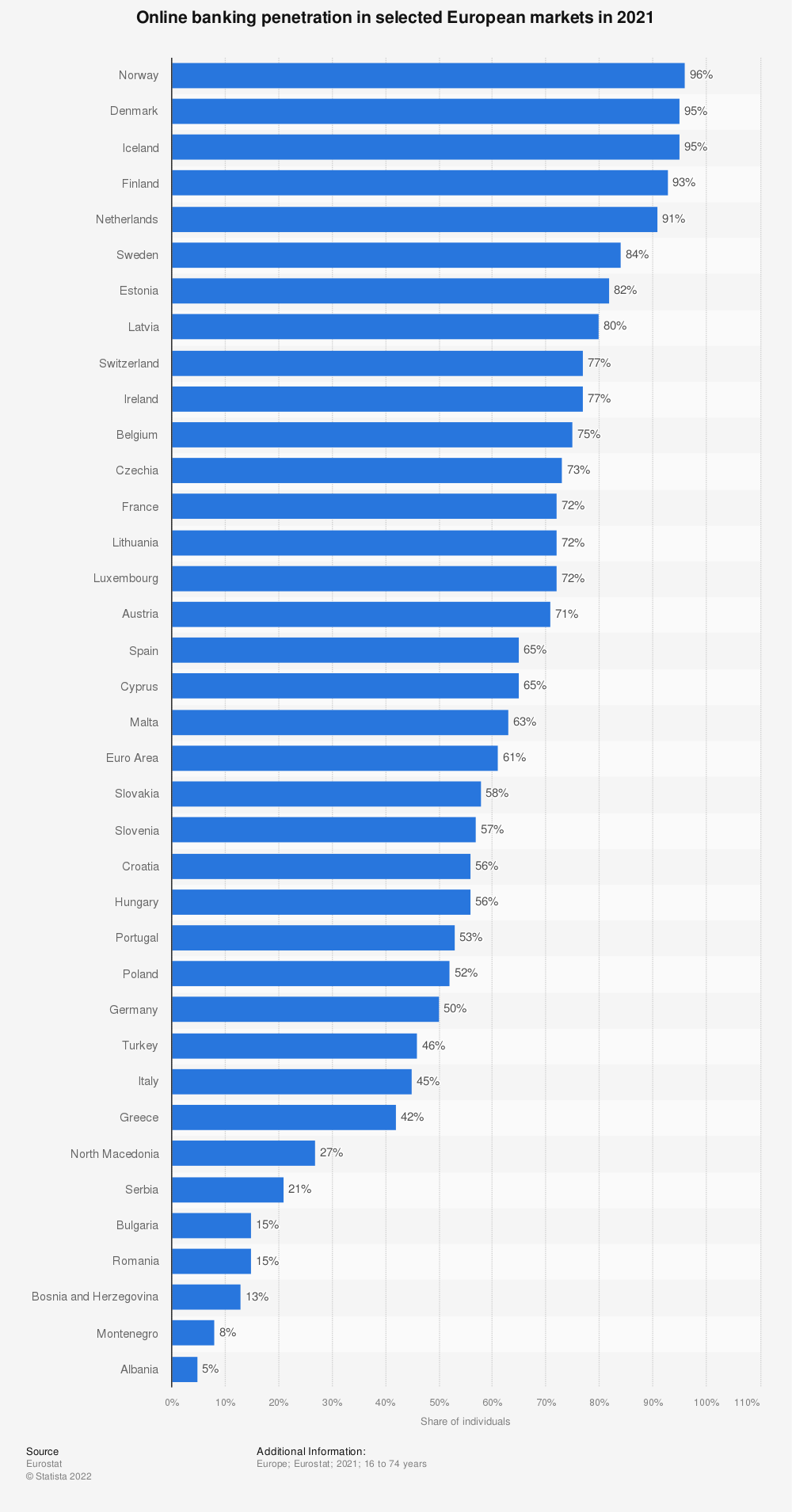Η διείσδυση της διαδικτυακής τραπεζικής στην Ευρώπη, το 2021