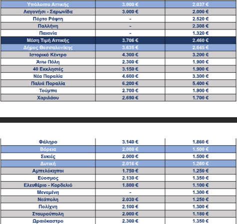 Ακολουθούν οι αναλυτικοί πίνακες τιμών ακινήτων ανά τ.μ. βάσει ηλικίας και περιοχής: