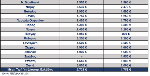 Στην υπόλοιπη Ελλάδα, με βάση τα στοιχεία της RE/MAX Ελλάς, εξίσου σημαντικές αυξήσεις παρατηρήθηκαν και στα νεόδμητα και στα παλαιότερα ακίνητα. Ειδικότερα, η μέση τιμή ανά τετραγωνικό στα παλαιότερα ακίνητα διαμορφώθηκε στα 1.759 ευρώ ανά τ.μ. και στα ακίνητα έως πέντε ετών στα 2.723 ευρώ ανά τ.μ., αυξήσεις 7,6% και 6,3% αντίστοιχα.