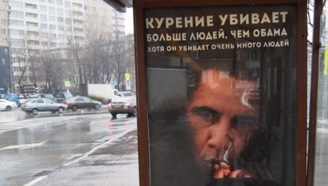 Για να πείσουν τους ανθρώπους να σταματήσουν το κάπνισμα, η συγκεκριμένη αφίσα με τον καπνιστή Ομάμα έχει κατακλύσει τους δρόμους της Μόσχας.
