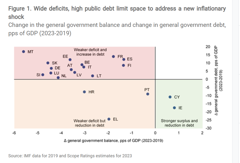 Η γερμανική Scope Ratings, η οποία πρόσφατα αναγνωρίστηκε από το Διοικητικό Συμβούλιο της Ευρωπαϊκής Κεντρικής Τράπεζας ως νέο εξωτερικό ίδρυμα αξιολόγησης πιστοληπτικής ικανότητας (ECAI) για τους σκοπούς του Πλαισίου Πιστοληπτικής Αξιολόγησης του Ευρωσυστήματος (ECAF), επισημαίνει ότι η Ελλάδα (αξιολόγηση BBB-/Stable) θα αποδειχθεί πιθανώς πιο ανθεκτική από την Ιταλία σε αυτό το σενάριο υψηλότερου πληθωρισμού.