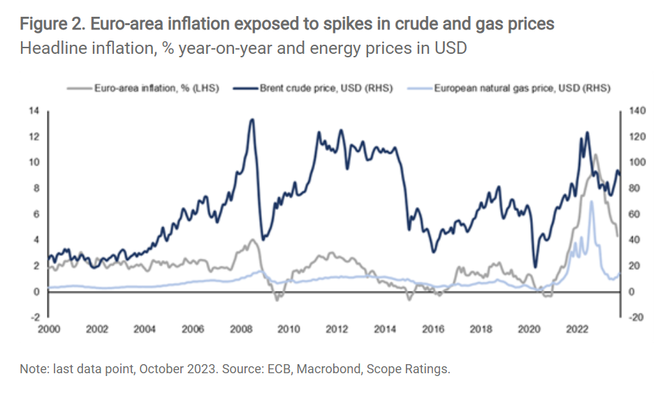 Η Scope προβλέπει ότι ο πληθωρισμός λόγω τιμών θα αποτελούσε την κύρια οικονομική ανησυχία από μια ευρύτερη σύγκρουση. Μια νέα άνοδος των τιμών των βασικών εμπορευμάτων είναι η σημαντικότερη πηγή οικονομικής μετάδοσης σε ένα σενάριο διεύρυνσης της σύγκρουσης. Αυτό οφείλεται στην ευπάθεια των ενεργειακών εγκαταστάσεων της Σαουδικής Αραβίας και των διαδρόμων μεταφοράς, όπως τα Στενά του Ορμούζ και η Διώρυγα του Σουέζ, σε στρατιωτικές ενέργειες ή/και σαμποτάζ. Οποιαδήποτε διαταραχή των αγορών πετρελαίου και εμπορευμάτων θα πρόσθετε πίεση στις αγορές αυτές, δεδομένης της λήξης της πρωτοβουλίας για τα σιτηρά της Μαύρης Θάλασσας, της πρόσφατης απαγόρευσης των εξαγωγών ρυζιού από την Ινδία, της συνεχιζόμενης ισχυρής αύξησης της ζήτησης στην οικονομία των Ηνωμένων Πολιτειών και της πρόσθετης τόνωσης από την Κίνα. Οι τελευταίες δύο δεκαετίες καταδεικνύουν στενή συσχέτιση μεταξύ του πληθωρισμού στη ζώνη του ευρώ και των τιμών του πετρελαίου και του φυσικού αερίου.