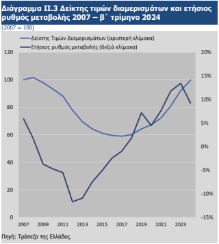 Αντίστοιχη είναι και η εξέλιξη του επιπέδου των ενοικίων, με το σχετικό δείκτη να διαμορφώνεται σε 103,2 με βάση τα στοιχεία του γ΄ τριμήνου 2024, έναντι 98,7 το γ΄ τρίμηνο 2023. Ο δείκτης ενοικίων, σε αντίθεση με το δείκτη τιμών κατοικιών, παραμένει σημαντικά χαμηλότερα από την υψηλότερη τιμή που έχει λάβει ιστορικά (124,3 το γ΄ τρίμηνο 2011)