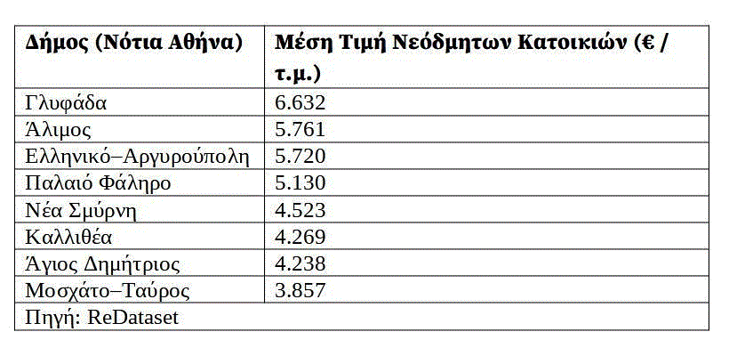 Σε σχέση με τις τιμές αυτή την στιγμή, η υψηλότερη μέση τιμή καταγράφεται στη Γλυφάδα, φτάνοντας τα 6.632 ευρώ ανά τ.μ. κατά μέσο όρο και ακολουθούν Αλιμος και Ελληνικό με 5.761 ευρώ και 5.720 ευρώ ανά τ.μ. αντίστοιχα. Στο Παλαιό Φάληρο επίσης ο πήχης στα καινούρια σπίτια κατά μέσο όρο αντιστοιχεί πάνω από το ψυχολογικό όριο των 5.000 ευρώ, στα 5.130 ευρώ, σύμφωνα πάντα με τα στοιχεία της ReDataset, ενώ στη Νέα Σμύρνη το αντίστοιχο νούμερο είναι λίγο πάνω από τις 4.500 ευρώ ανά τ.μ..