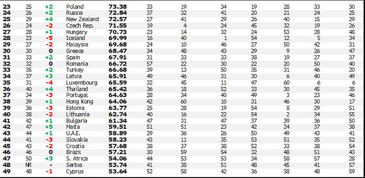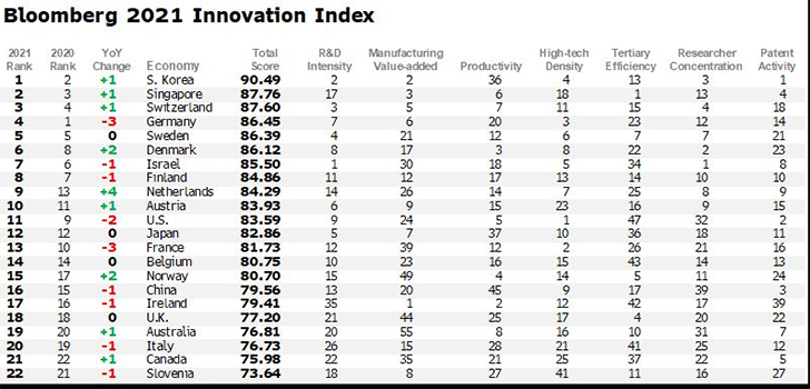 Μάλιστα, τα προαναφερθέντα ευρωπαϊκά κράτη καταφέρνουν για το 2021 να εκτοπίσουν από τη λίστα με τις δέκα πιο καινοτόμες οικονομίες του πλανήτη τις ΗΠΑ, που κατατάσσονται στην 11η θέση, χάνοντας δύο θέσεις έναντι του 2020. Η Κίνα, από την πλευρά της, καταλαμβάνει για το 2021 μόλις τη 16η θέση της σχετικής κατάταξης.