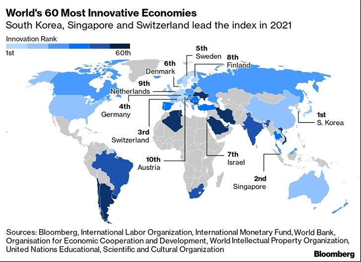 Πρωταθλήτρια κόσμου στο πεδίο καινοτομία ανακηρύσσεται για το 2021 η Νότιος Κορέα, με σκορ 90,49, με τη Σιγκαπούρη να κατατάσσεται δεύτερη και την Ελβετία να παίρνει το …αργυρό στη λίστα με τις πιο καινοτόμες οικονομίες του πλανήτη.