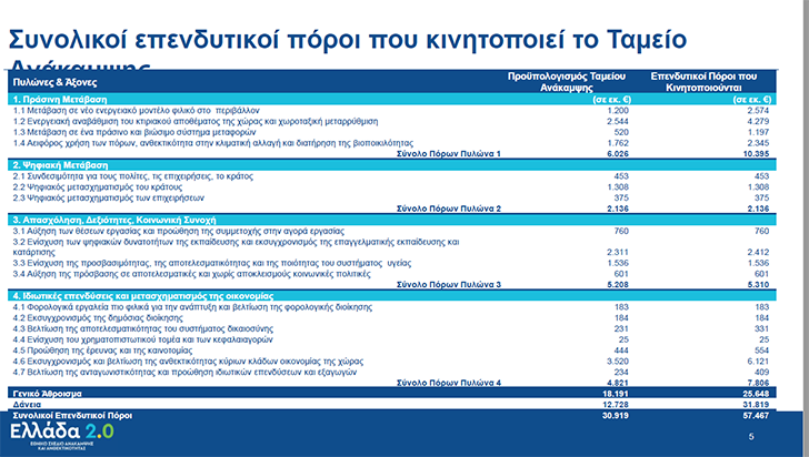 Τα 170 έργα και μεταρρυθμίσεις του Εθνικού Σχεδίου Ανάκαμψης βασίζονται σε τέσσερις πυλώνες: ψηφιακός μετασχηματισμός, πράσινη ανάπτυξη, επενδύσεις και νέο κοινωνικό μοντέλο. Από τα €17,8 δισ. των επιδοτήσεων στην Ψηφιακή Μετάβαση θα κατευθυνθούν €2,136 δισ., στην Πράσινη Μετάβαση €6,026 δισ., στην Απασχόληση και τις Δεξιότητες €5,208 δισ., ενώ οι ιδιωτικές επενδύσεις και ο μετασχηματισμός της οικονομίας θα απορροφήσουν €4,821 δισ, όπως αναφέρει ο ΣΕΠΕ σε δελτίο του.
