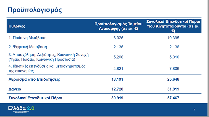 “Αλλάζει το υπόδειγμα της ελληνικής οικονομίας, που γίνεται εξωστρεφής, με ψηφιακό κράτος και φιλικό προς την ανάπτυξη φορολογικό σύστημα. Αυτός είναι και ο λόγος που το σχέδιο βαφτίζεται “Ελλάδα 2.0”. Συζητάμε για κάτι πολύ μεγαλύτερο από ένα δεύτερο ΕΣΠΑ”, τόνισε χθες ο Έλληνας πρωθυπουργός, παρουσιάζοντας το εθνικό Σχέδιο Ανάκαμψης. Να σημειωθεί ότι το Σχέδιο θα συζητηθεί στη Βουλή και μετά από την έγκρισή του από τα ευρωπαϊκά όργανα, θα έρθει ξανά προς συζήτηση με τις πολιτικές και κοινωνικές δυνάμεις με τη μορφή του σχεδίου νόμου στη Βουλή.