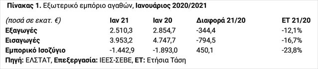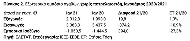 Συμπεριλαμβανομένων των πετρελαιοειδών, οι ελληνικές εξαγωγές παρουσίασαν μείωση κατά €344,4 εκατ., δηλαδή 12,1% και διαμορφώθηκαν σε €2.510,3 εκατ., έναντι €2.854,7 εκατ. τον Ιανουάριο του 2020, ενώ αντίστοιχη ήταν και η πορεία των εισαγωγών, οι οποίες μειώθηκαν από €4.747,7 εκατ. πέρυσι σε €3.953,2 εκατ. φέτος, με τη διαφορά να ανέρχεται σε €794,5 εκατ., δηλαδή 16,7%.