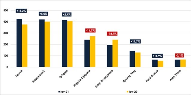 Σε κλαδικό επίπεδο, τα χημικά προϊόντα συνέχισαν να πρωταγωνιστούν και τον Ιανουάριο του 2021, καθώς κατέγραψαν αύξηση εξαγωγών κατά €49,4 εκατ., δηλαδή 13,2% συγκριτικά με τον αντίστοιχο μήνα του 2020. Ιδιαίτερα θετική κρίνεται η συνεισφορά των εξαγωγών βιομηχανικών προϊόντων καθώς αυξήθηκαν κατά €19,9 εκατ., δηλαδή 5,0% συνεχίζοντας την ανοδική πορεία που είχε καταγραφεί τον Δεκέμβριο του 2020, ενώ αύξηση σημείωσαν και οι εξαγωγές τροφίμων κατά €9,7 εκατ., δηλαδή 2,4%.