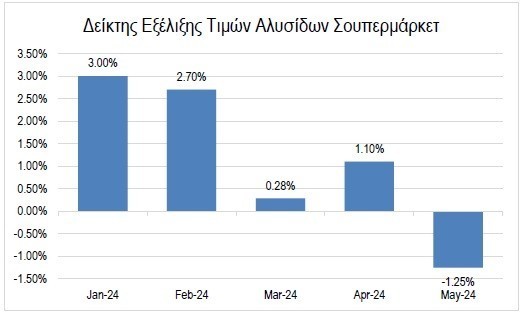 - Η καθαρή μείωση του δείκτη εξέλιξης τιμών αλυσίδων σουπερμάρκετ τον Μάιο 2024 δείχνει ότι ο πληθωρισμός στις αλυσίδες σουπερμάρκετ είναι αρνητικός της τάξης του -1,25% (έναντι +1,10% τον Απρίλιο, +0,28% τον Μάρτιο, +2,70% τον Φεβρουάριο και +3,00% τον Ιανουάριο 2024).