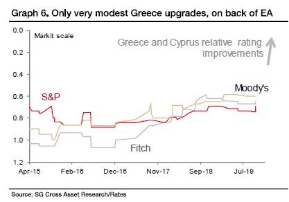 Η Societe Generale αναμένει αλλεπάλληλες αναβαθμίσεις με αφορμή τη μαζική συρρίκνωση των αποδόσεων των ομολόγων. Παρά το γεγονός, προσθέτει η έκθεση, ότι οι οίκοι αξιολόγησης αυτό δεν το παραδέχονται, ωστόσο τείνουν πάντοτε να παρακολουθούν την πορεία των spreads.