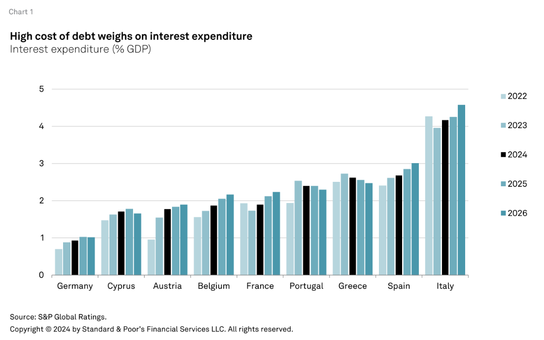 Αναφορικά με την Ελλάδα, η S&P εξήγησε ότι πληρωμές τόκων της Ελλάδας και της Πορτογαλίας, οι οποίες ήταν παρόμοιες με αυτές της Ισπανίας το 2022 (2,4% του ΑΕΠ), θα παραμείνουν συγκρατημένες έως το 2026. Αυτό θα υποστηριχθεί από τα σημαντικά ποσοστά του χρέους που ακόμα ανήκουν σε δημόσιους φορείς (official sector) περίπου 20% για την Πορτογαλία και 75% για την Ελλάδα και την αναμενόμενη μείωση του δημόσιου χρέους ως ποσοστό του ΑΕΠ.