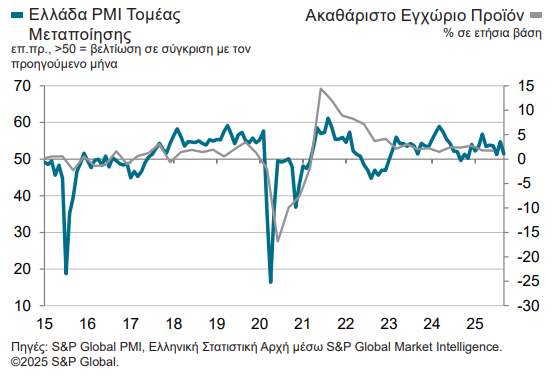 Κλείνοντας στις 52.0 μονάδες τον Σεπτέμβριο, ο εποχικά προσαρμοσμένος Δείκτης Υπευθύνων Προμηθειών της S&P Global για τον τομέα μεταποίησης στην Ελλάδα (Purchasing Managers’ Index™ – PMI) υποχώρησε από τις 54.5 μονάδες του Αυγούστου. Τα τελευταία στοιχεία υπέδειξαν μέτρια ανάκαμψη της υγείας του τομέα, μολονότι ήταν η δεύτερη βραδύτερη σε διάστημα δέκα μηνών (η πρώτη ήταν τον Ιούλιο του 2025). Εντούτοις, ο ρυθμός αύξησης κινήθηκε σε επίπεδα υψηλότερα από τον μακροχρόνιο μέσο όρο της έρευνας (50.4 μονάδες).