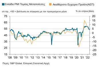 Η S&P Global για τον τομέα μεταποίησης στην Ελλάδα (Purchasing Managers’ Index – PMI) έκλεισε στις 53.8 μονάδες τον Μάιο, τιμή χαμηλότερη από τις 54.8 μονάδες του Απριλίου. Η τελευταία τιμή του κύριου δείκτη υπέδειξε σταθερή βελτίωση της υγείας του ελληνικού μεταποιητικού τομέα, ωστόσο η συνολική ανάπτυξη εξασθένησε στη βραδύτερη που έχει καταγραφεί από τον Μάρτιο του 2021.