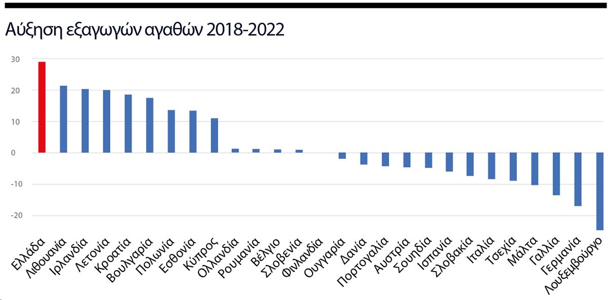 Ωστόσο, η αλλαγή είναι και ποιοτική, αφού οι εξαγωγές προϊόντων όχι μόνο ξεπέρασαν τον τουρισμό, αλλά η Ελλάδα καταφέρνει πλέον να «πουλάει» ακόμα και τεχνολογία στο εξωτερικό! Μετά το 2020, η χώρα καταφέρνει σταθερά να μη στηρίζεται αποκλειστικά στον τουρισμό: τα έσοδα από εξαγωγές υπηρεσιών -κυρίαρχα από τον τουρισμό που ξεπέρασε κάθε προηγούμενο πέρυσι- αυξήθηκαν από 40,4 δισ. ευρώ το 2019 στα 49 δισ. το 2023 σημειώνοντας αύξηση 20%. Αλλά οι εξαγωγές αγαθών προς το εξωτερικό αυξήθηκαν από 33,1 δισ. το 2019 σε 49,5 δισ. το 2023, καταγράφοντας αύξηση 50% (πιν. 1) μέσα σε μια πενταετία πρωτοφανών αλλεπάλληλων κρίσεων! Ηδη από το 2022 μάλιστα, η Ελλάδα σημείωνε τη μεγαλύτερη αύξηση του μεριδίου εξαγωγών αγαθών στην Ε.Ε. σε μια πενταετία, όταν όμως (εν σχέσει με το 2018) η αύξηση δεν ξεπερνούσε τότε το 30% σύμφωνα με τη Eurostat (πιν. 2).