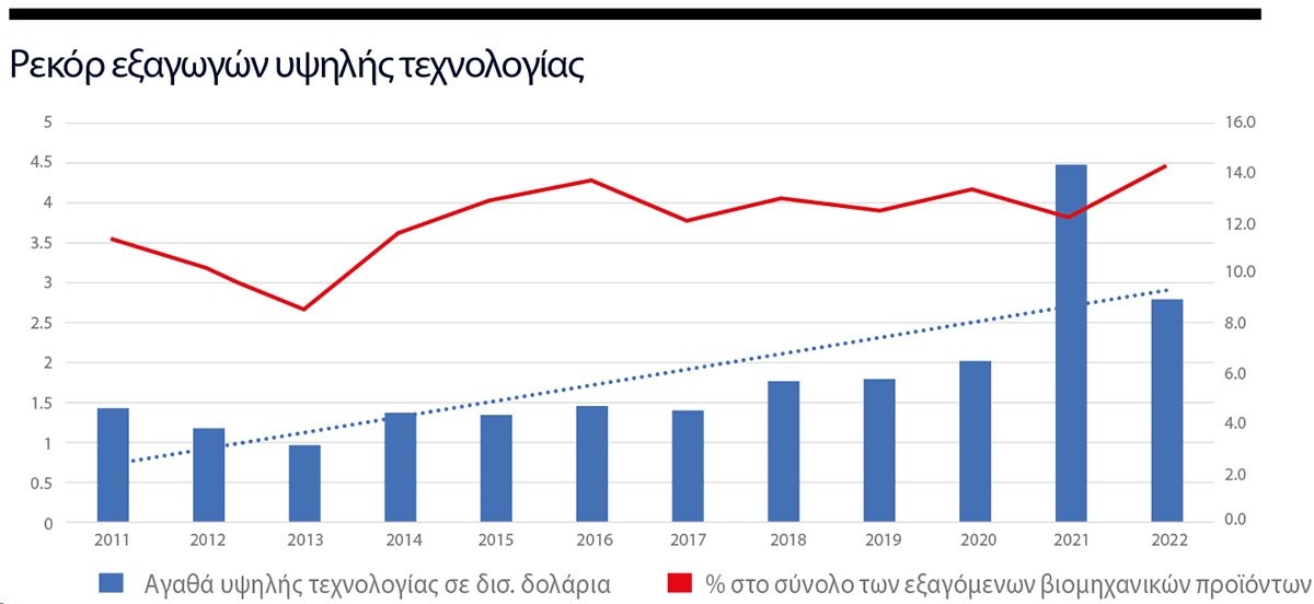 Ιδιαίτερα εντυπωσιάζει η δυναμική αύξηση εξαγωγών ελληνικών προϊόντων υψηλής τεχνολογίας. Το 2022 έφτασαν στο υψηλότερο ποσοστό μεταξύ των επεξεργασμένων βιομηχανικών προϊόντων. Η χώρα μας έφτασε «να κοντράρει στα ίσα» όχι μόνο την «πρωταθλήτρια» Ευρώπης Γερμανία, αλλά ακόμα και την παγκόσμια υπερδύναμη στις εξαγωγές τεχνολογίας Ν. Κορέα!