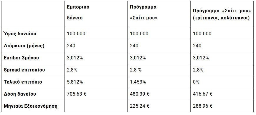 Για το ίδιο δάνειο, με διάρκεια αποπληρωμής 20 χρόνια, η μηνιαία δόση είναι 705,63 ευρώ και περιορίζεται αντίστοιχα με το πρόγραμμα στα 480,39 ευρώ (όφελος 225,24 ευρώ ή 2.702 ευρώ τον χρόνο. Για τρίτεκνους-πολύτεκνους, η δόση μειώνεται στα 416,67 ευρώ (όφελος 288,96 ευρώ ή 3.467,52 ευρώ τον χρόνο).