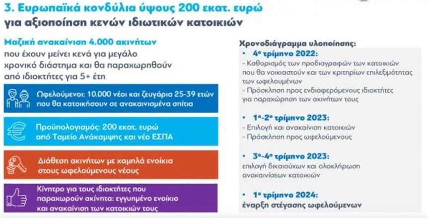Προβλέπεται να αξιοποιηθούν ευρωπαϊκά κονδύλια 200 εκατ. ευρώ για μαζική ανακαίνιση 4.000 ακινήτων που έχουν μείνει κενά για μεγάλο χρονικό διάστημα και θα παραχωρηθούν από ιδιοκτήτες για άνω των πέντε ετών. Το κράτος θα τα ανακαινίσει και θα τα παραχωρήσει με κοινωνικά κριτήρια σε νέους.