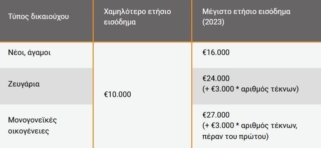 Εισοδηματικά Κριτήρια Δικαιούχων (Τα ανώτατα όρια εισοδήματος, ταυτίζονται με τα όρια που καθορίζονται για την καταβολή του επιδόματος θέρμανσης ανάλογα με την εκάστοτε ισχύουσα Κοινή Υπουργική Απόφαση. Ειδικά, για το 2023, αυτά ορίζονται ως: