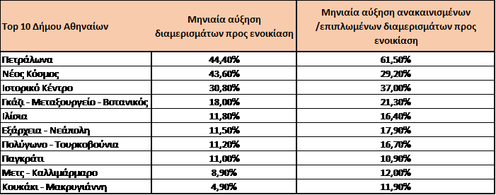 Σημαντική αύξηση σημειώνεται στην προσφορά διαμερισμάτων προς ενοικίαση τις τελευταίες 30 ημέρες, σύμφωνα με έρευνα του Spitogatos, με τα αστικά κέντρα να διατηρούν την πρωτιά. Η έρευνα συνέκρινε τον αριθμό διαθέσιμων διαμερισμάτων (stock) προς ενοικίαση στα μέσα Απριλίου σε σχέση με τα μέσα Μαρτίου 2020. Σε κάποιες περιοχές της Αττικής η αύξηση του stock είναι ιδιαίτερα μεγάλη, όπως για παράδειγμα σε Πετράλωνα (44,40%), Νέο Κόσμο, (43,60%), το Ιστορικό Κέντρο της Αθήνας (30,80%) και τον Πειραιά (27,20%).