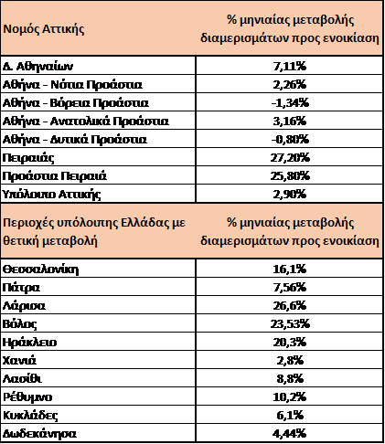 Οι μεταβολές στην προσφορά διαμερισμάτων προς ενοικίαση σε κάποιες περιοχές είναι αξιοσημείωτες – αν και ενδεχομένως να είναι τόσο μεγάλες ποσοστιαία σε κάποιες περιπτώσεις επειδή ξεκίνησαν από χαμηλή βάση. Αναφορικά με τις ζητούμενες τιμές, αν και θεωρητικά η αύξηση της ποσότητας θα φέρει μείωσή τους, αυτό δεν έχει παρατηρηθεί ακόμα με συνέπεια ως προς τις μέσες τιμές.