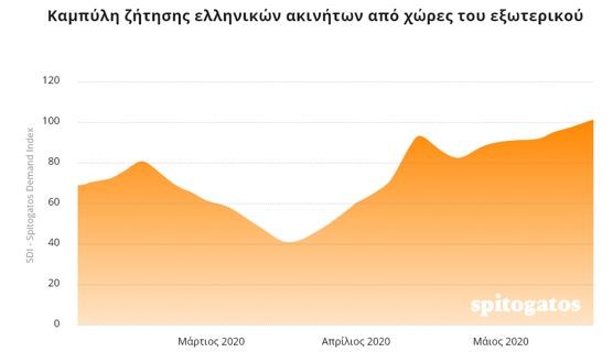 Αύξηση της ζήτησης από το εξωτερικό εμφανίζεται για τον μήνα Μάιο, σύμφωνα με τον δείκτη ζήτησης SDI, ο οποίος διαμορφώνεται από τον όγκο αναζητήσεων του Spitogatos. Πιο συγκεκριμένα, οι επισκέψεις στην ιστοσελίδα αγγελιών ακινήτων από χρήστες που διαμένουν σε χώρες του εξωτερικού ανέβηκαν τον τελευταίο μήνα κατά 30% σε σχέση με πέρυσι.