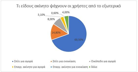 Μέσα από έρευνα που διεξήχθη στην ιστοσελίδα σε 2.600 χρήστες από το εξωτερικό που αναζητούν ακίνητο στην Ελλάδα, προκύπτει ότι το 69,5% προσβλέπουν σε αγορά κατοικίας, έναντι 14,8% που προσβλέπουν σε ενοικίαση, ενώ το 8% αναζητούν οικόπεδο για αγορά, το 3,1% επαγγελματικό ακίνητο για αγορά, το 0,6% επαγγελματικό ακίνητο για ενοικίαση και ένα 4% λοιπές κατηγορίες.