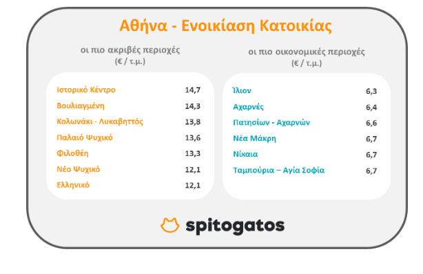 Ως προς την ενοικίαση κατοικίας, το ιστορικό κέντρο, η Βουλιαγμένη, η περιοχή του Κολωνακίου και του Λυκαβηττού, το Παλαιό Ψυχικό, το Νέο Ψυχικό και η Φιλοθέη είναι μεταξύ των ακριβότερων περιοχών της Αττικής, ενώ στη λίστα με τις περιοχές όπου εντοπίζονται τα ακριβότερα ενοίκια συγκαταλέγεται και το Ελληνικό.