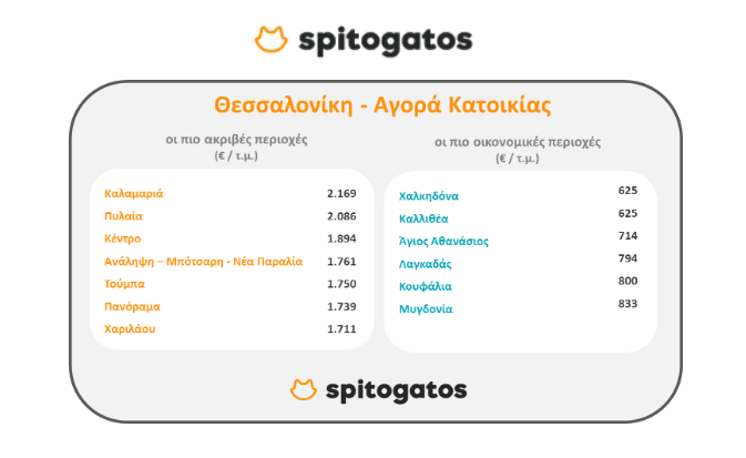 Αντίστοιχα, στη Θεσσαλονίκη, οι πιο ακριβές περιοχές για αγορά κατοικίας το α’ τρίμηνο του 2022 ήταν, μεταξύ άλλων, η Καλαμαριά, η περιοχή του κέντρου και το Πανόραμα -στοιχείο το οποίο δεν προκαλεί εντύπωση καθώς πρόκειται για περιοχές που παραδοσιακά ανήκουν στις ακριβότερες τις συμπρωτεύουσας, η περιοχή Ανάληψη – Μπότσαρη – Νέα Παραλία, η Πυλαία και η Τούμπα. Ως προς την αγορά κατοικίας, οι οικονομικότερες περιοχές περιλαμβάνουν, μεταξύ άλλων, την Καλλιθέα, τη Χαλκηδόνα, τον Άγιο Αθανάσιο, τον Λαγκαδά και τα Μυγδόνια.