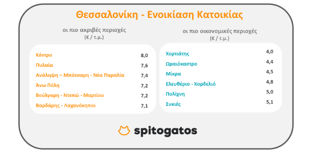 Σε ό,τι αφορά την ενοικίαση κατοικίας, οι ακριβότερες περιοχές ήταν, πέραν του κέντρου της πόλης, η Πυλαία, η Ανάληψη – Μπότσαρη – Νέα Παραλία, η Άνω Πόλη και οι περιοχές Βούλγαρη – Ντεπώ – Μαρτίου και Βαρδάρης – Λαχανόκηποι. Στις οικονομικότερες περιοχές για ενοικίαση κατοικίας, εντοπίζονται ο Χορτιάτης, το Ωραιόκαστρο, ο Δήμος Μίκρας, η Πολίχνη και οι Συκιές.