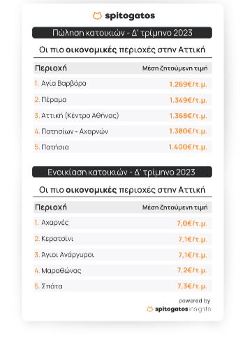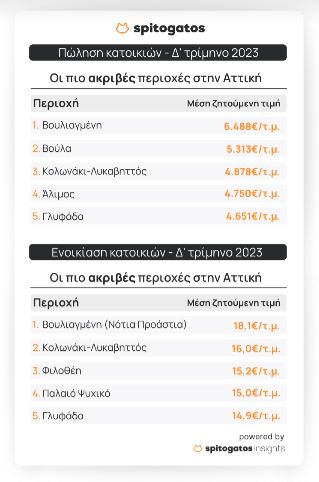 Η πιο ακριβή περιοχή της Αττικής για ενοικίαση αλλά και αγορά κατοικίας είναι η Βουλιαγμένη στα Νότια Προάστια, με μέση ζητούμενη τιμή 18,1€/τ.μ. και 6.488€/τ.μ. αντίστοιχα. Η περιοχή Κολωνάκι – Λυκαβηττός και η Γλυφάδα επίσης κατατάσσονται στις ακριβότερες περιοχές της Αττικής για ενοικίαση και για αγορά κατοικίας. Αντίθετα, στις οικονομικότερες περιοχές για ενοικίαση κατοικίας περιλαμβάνονται οι Αχαρνές και το Κερατσίνι, ενώ για αγορά κατοικίας η Αγία Βαρβάρα και το Πέραμα.