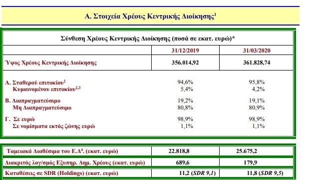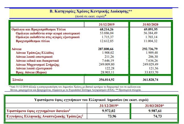 Τα 361,828 δις ευρώ χρέους επιμερίζονται σε 292,7 δις ευρώ δανείων και 69,091 δις ευρώ ομολόγων και βραχυπρόθεσμων τίτλων. Το πρώτο τρίμηνο του 2020 το ελληνικό δημόσιο προχώρησε σε δύο εκδόσεις ομολόγων συνολικού ύψους 5,8 δις ευρώ εκ των οποίων 3,3 δις ευρώ αφορούσαν το 30ετές για το swap της Εθνικής Τράπεζας ΕΤΕ +3,18% και 2,5 δις ευρώ το 15ετές που εκδόθηκε τον Φεβρουάριο με επιτόκιο 1,875%.