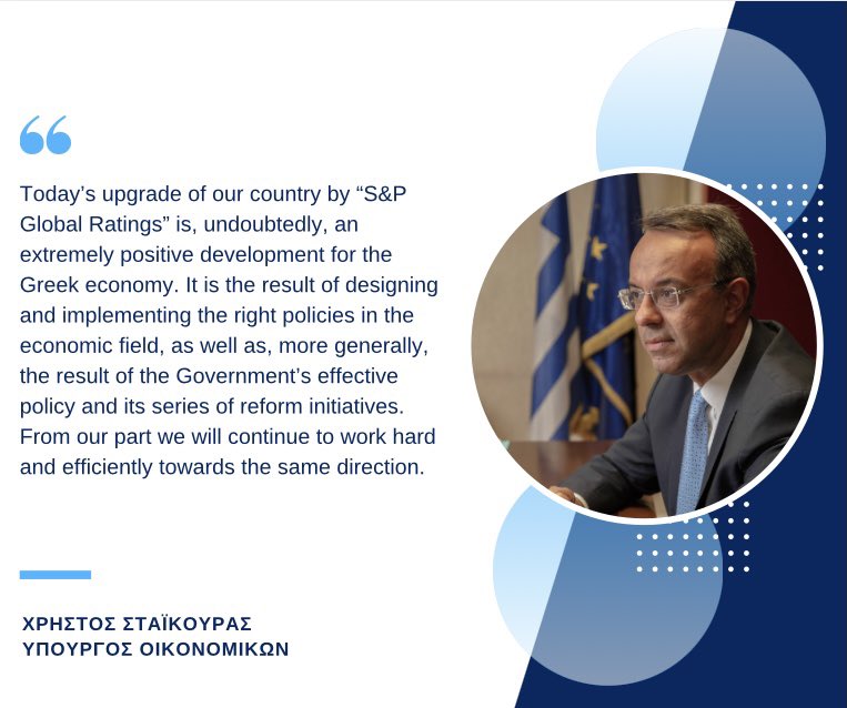 Σε δήλωσή του ο Υπουργός Οικονομικών Χρήστος Σταϊκούρας τονίζει πως «πρόκειται, αναμφίβολα, για ένα εξαιρετικά σημαντικό, θετικό γεγονός για την ελληνική οικονομία, που οφείλεται στον σχεδιασμό και στην υλοποίηση ορθών πολιτικών στο πεδίο της οικονομίας και γενικότερα στην αποτελεσματικότητα της κυβερνητικής πολιτικής, καθώς και σε σειρά μεταρρυθμιστικών πρωτοβουλιών».