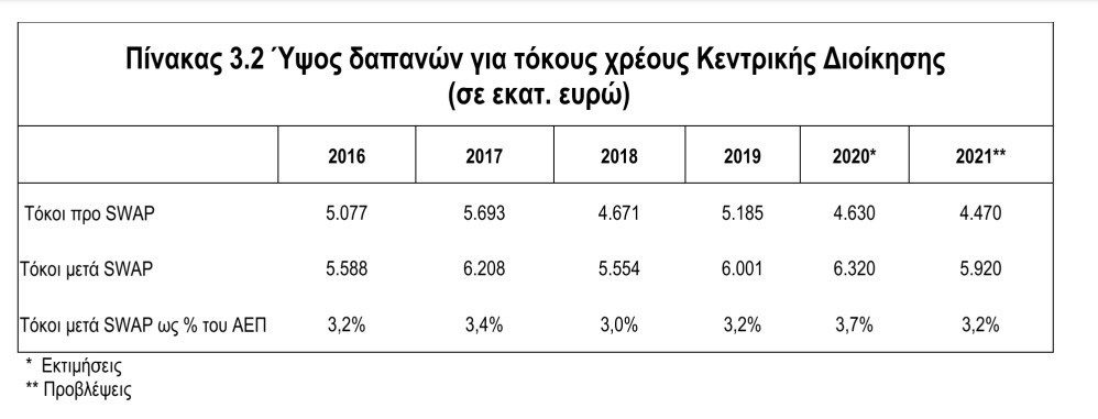 Μόνο για φέτος ο Προυπολογισμός επιβαρύνεται με πρόσθετους τόκους εξαιτιας των swaps ύψους 1,69 δισ. ευρώ (τόκοι μετά swap 6,2 δισ. ευρώ – προ swap 4,6 δισ. ευρώ) ενώ για το 2021 η πρόσθετη επιβάρυνση αγγίζει το 1,45 δισ. ευρώ (5,9 δισ. ευρώ μετά swap – 4,47 δισ. ευρώ προ swap).