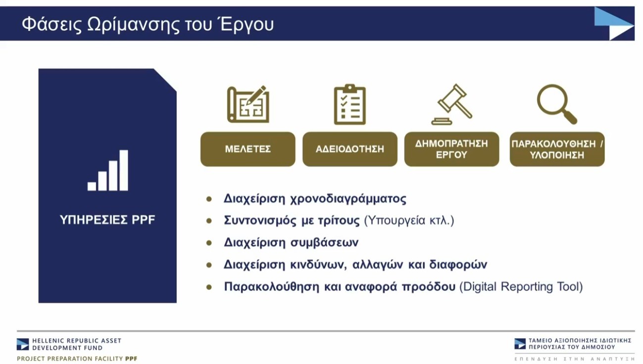 Έργα προϋπολογισμού άνω των δύο δισεκατομμυρίων ευρώ θα αναλάβει σε πρώτη φάση η Μονάδα Ωρίμανσης Έργων του ΤΑΙΠΕΔ (Project Preparation Facility – PPF), όπως αποκάλυψε ο εντεταλμένος σύμβουλος του ΤΑΙΠΕΔ κ. Παναγιώτης Σταμπουλίδης, σε ημερίδα που πραγματοποίησε το Υπερταμείο με θέμα «Βιώσιμη Ανάπτυξη: Ο ρόλος των Δημοσίων Επιχειρήσεων και η Στρατηγική κατεύθυνσης προς το μέλλον» στο πλαίσιο της 85ης ΔΕΘ.