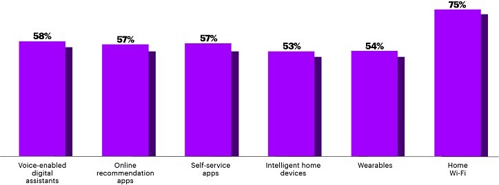Στο πλαίσιο αυτό, η εμφάνιση του COVID-19 επιταχύνει την ψηφιακή μετάβαση ευρύτερα. Για παράδειγμα, ο αριθμός των καταναλωτών που δήλωσαν ότι ενδιαφέρονται να αγοράσουν ή να αυξήσουν τη χρήση της τεχνολογίας έχει αυξηθεί σημαντικά. Περισσότεροι από τους μισούς ερωτηθέντες δήλωσαν ότι είναι πιθανό να αυξήσουν τη χρήση ψηφιακών βοηθών με δυνατότητα φωνητικής αναγνώρισης, εφαρμογών διαδικτυακών προτάσεων, εφαρμογών self-service, έξυπνων οικιακών συσκευών και wearables.