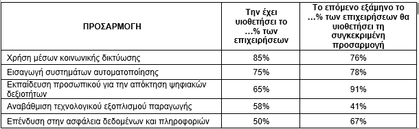Από την έρευνα προέκυψαν οι πέντε κύριες προσαρμογές ψηφιακού μετασχηματισμού που έχουν ήδη υιοθετηθεί από τις μεταποιητικές επιχειρήσεις με έδρα την Ελληνική περιφέρεια και η πρόθεση των επιχειρήσεων να συνεχίσουν να επενδύουν στις συγκεκριμένες προσαρμογές το επόμενο εξάμηνο: